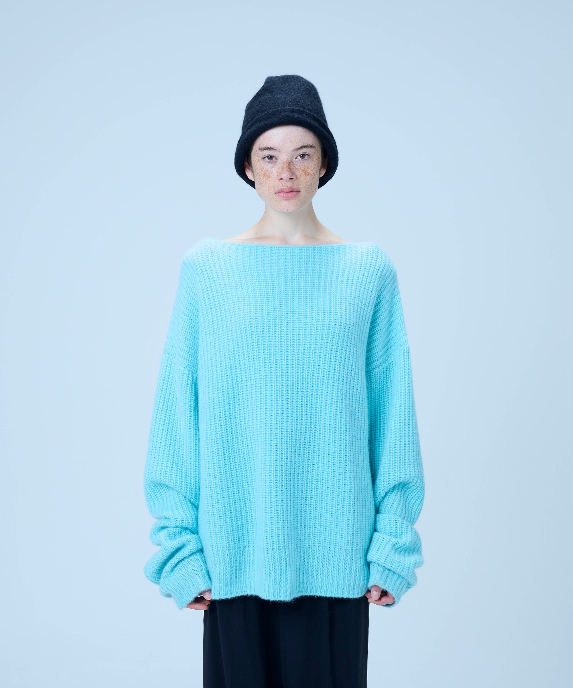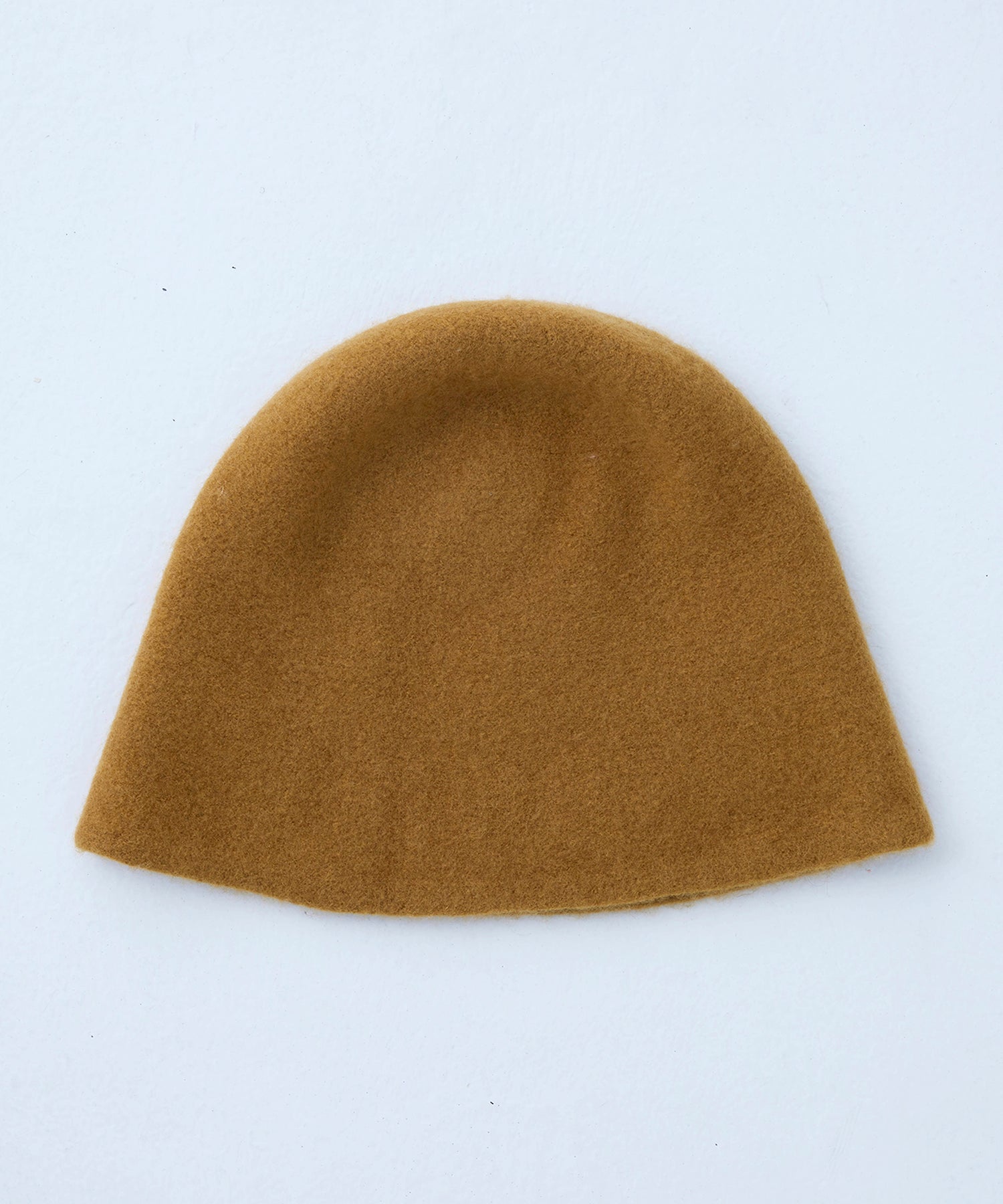15番手単糸を3本取り、7ゲージでややゆるく編んだニット帽を、水洗いと強縮加工によりギュッと圧縮した贅沢なカシミヤハット。