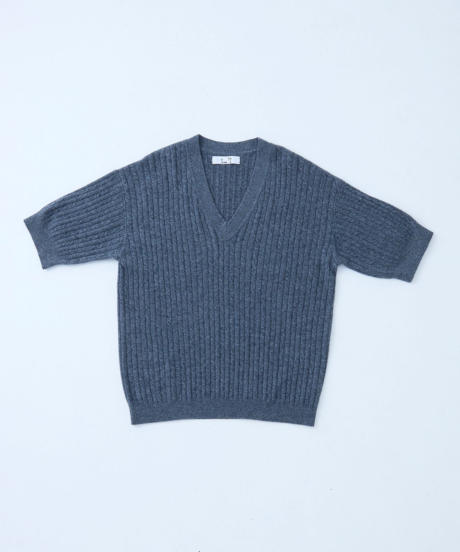 深めの襟ぐりが女性らしさを引き立てつつ、リブは太めにとってトラッドな印象に。